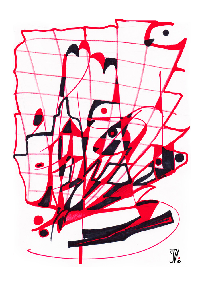 Abstract art created one afternoon with a red and black marker and certain local accents of red pencil.
