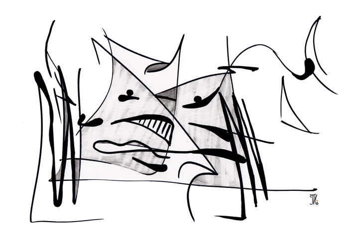 When a bird and a fish encounter in a vegetal environment, an abstract world is created with bold strokes of markers.